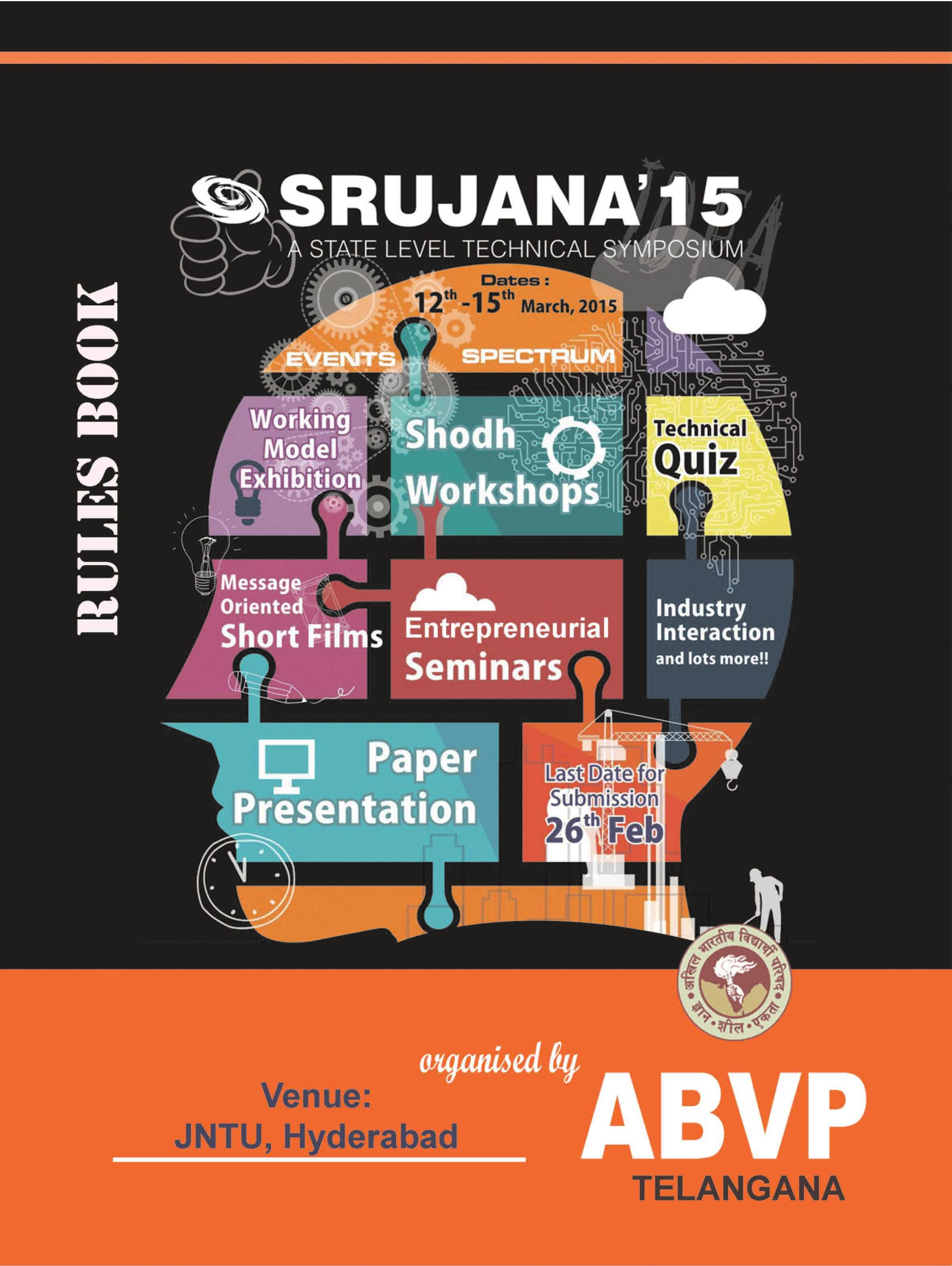 Srujana' 15 is a state level Technical Symposium organised by Telangana Unit of ABVP. Find the registration form and rule book below.